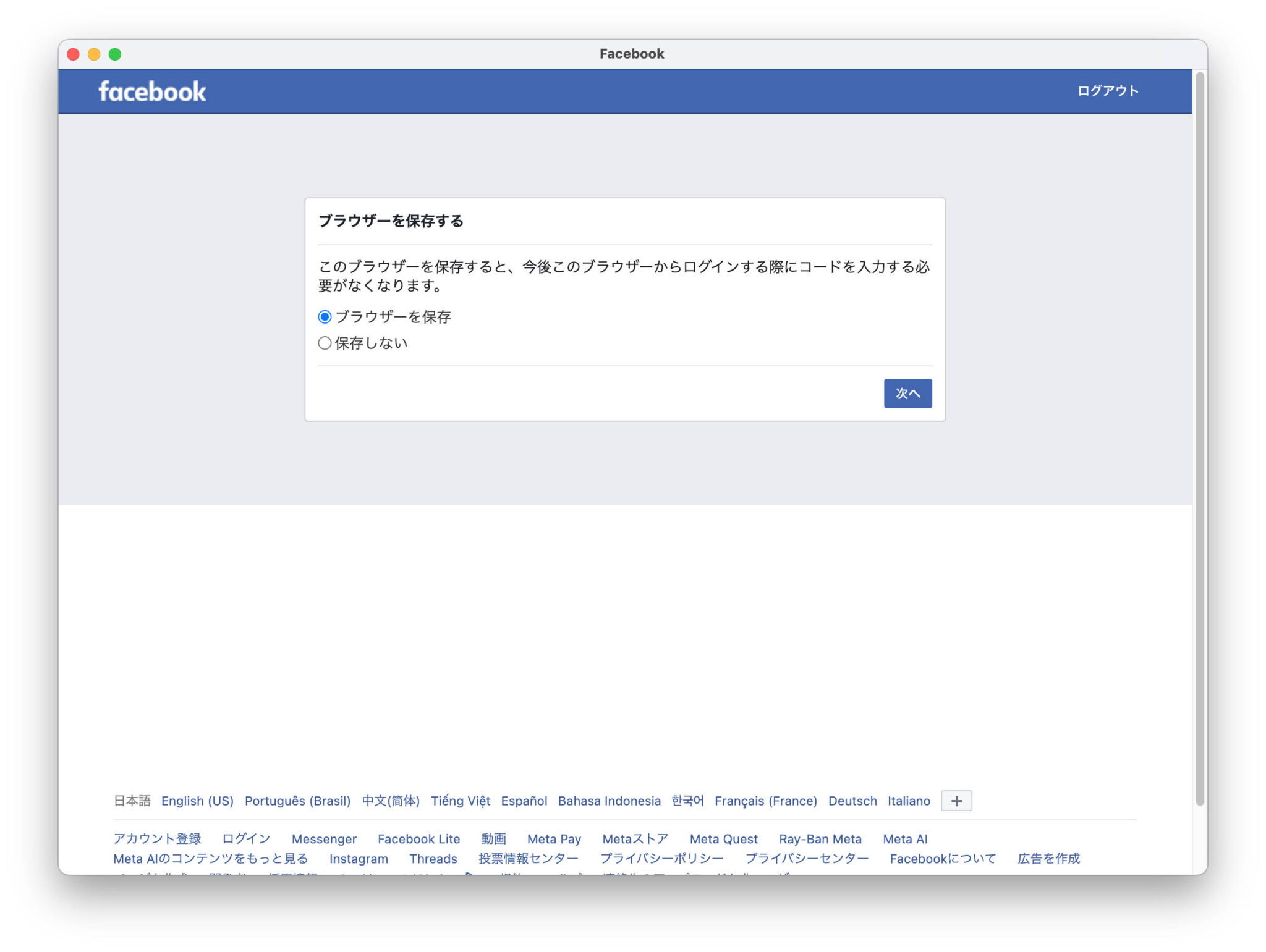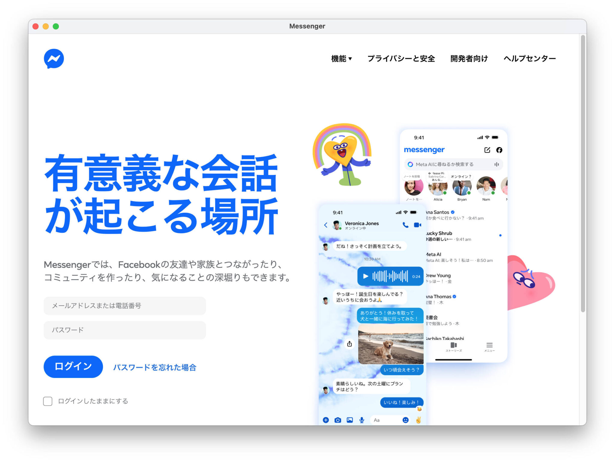 Messenger Helperを開くと messenger.com が表示されます。ここにFacebookのID/PWを入力し、"ログインしたままにする"にチェックを入れログインします。
