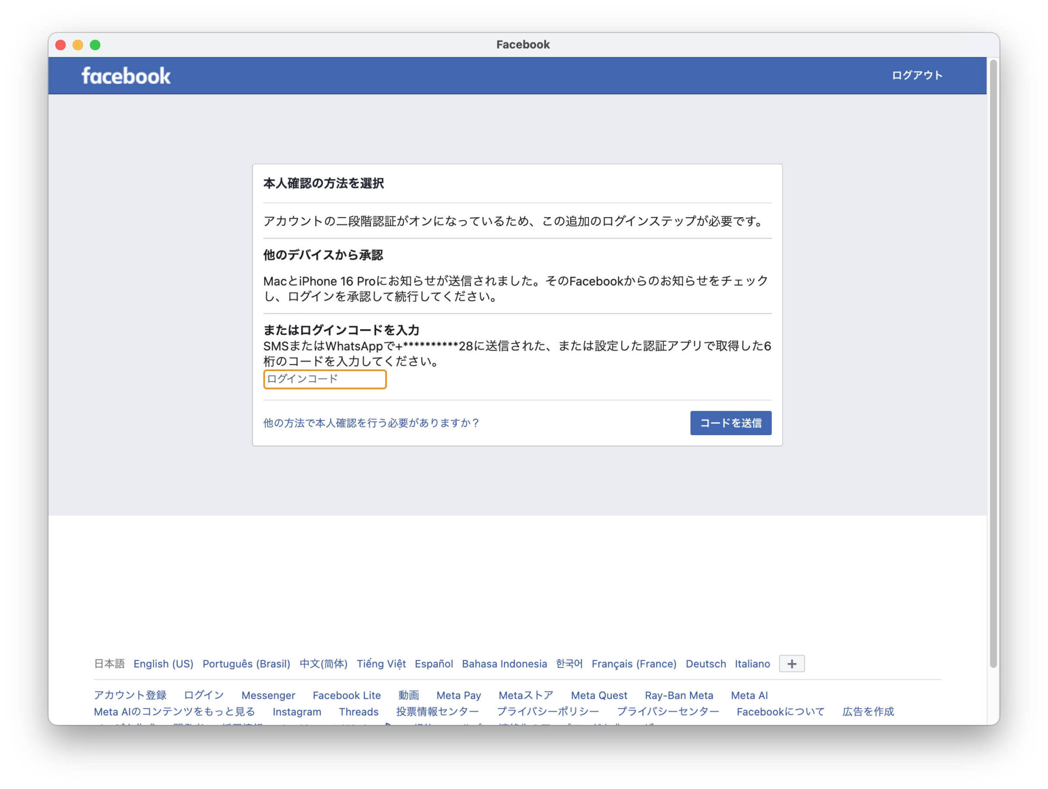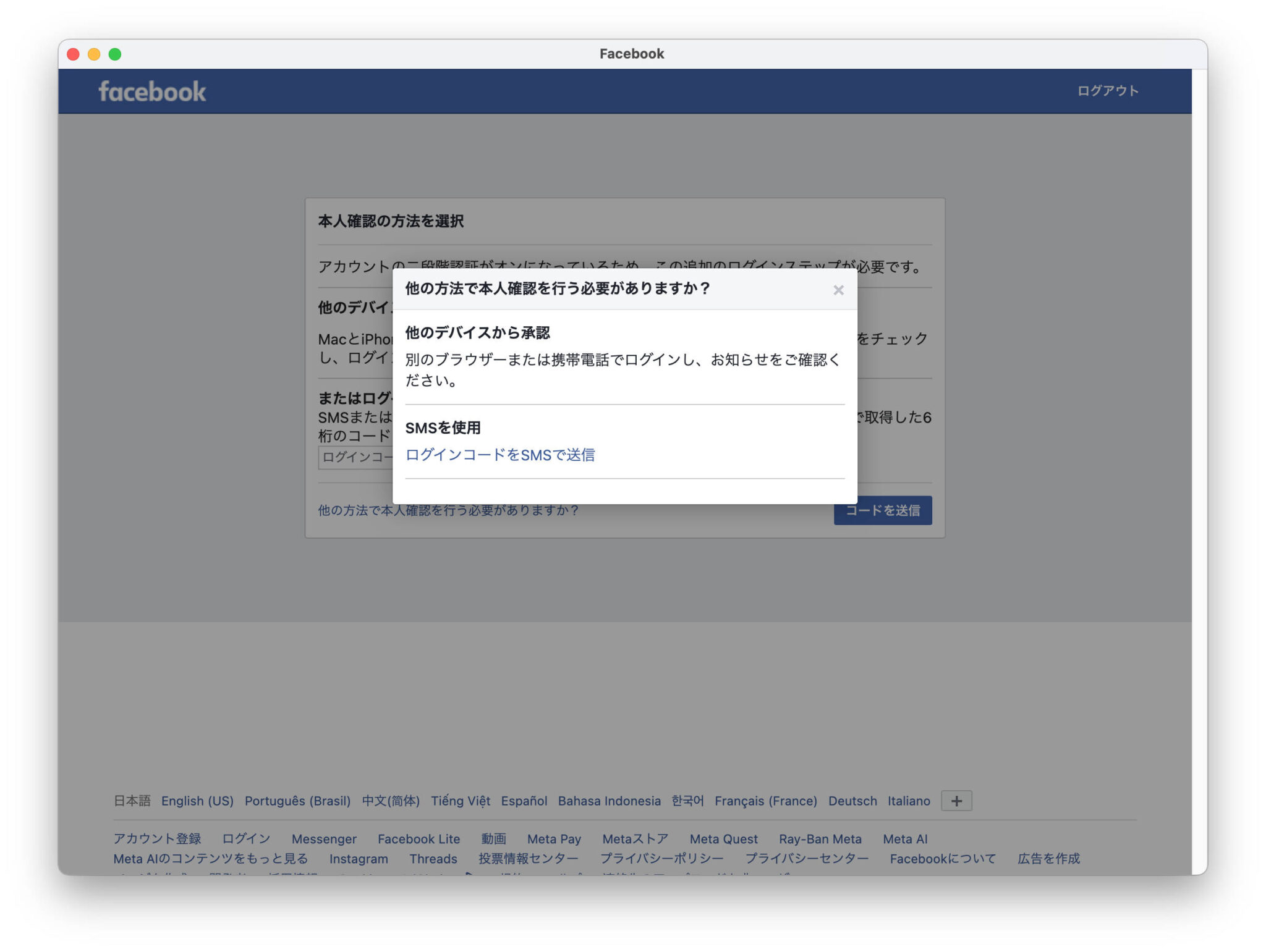 ここではログイン済のFacebook(アプリなども含む)を開いて認証できるはずなんですが、今回なぜかページに変化がありませんでした。その場合は最下段の"他の方法で本人確認を行う必要がありますか?"をクリックしSMS認証します。