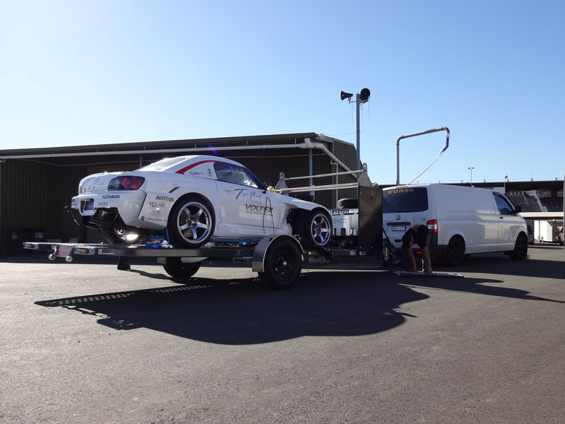 他イベントがありサーキットではまだメンテナンス作業ができないため、われわれのチームのS2000はすぐ近くのチューニングショップGARAGE 88さんに車両を運びました。オーストラリアでは一般的(?)なとっても便利な牽引装置。